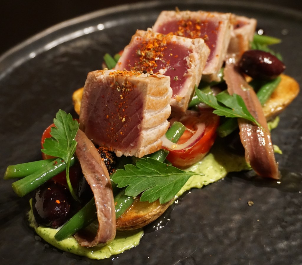 - Auf dem Teller die Petersilienmayonnaise mit einer Küchenpalette fein mittig ausstreichen, die Kartoffeln, Bohnen, Tomaten, Oliven und Zwiebeln darauf anrichten. Die Thunfischfilets in Tranchen aufschneiden und sofort auf dem Salat anrichten. Etwas groben frischen Pfeffer und das Piment d’espelette über den Thunfisch geben, die Sardellenfilets mit den restlichen Petersilienblättern auf den Salat geben und servieren.