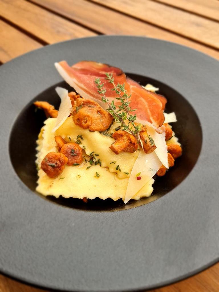 - Die Ravioli in einem tiefen Teller, mit den Pfifferlingen, der Butter und dem Thymian anrichten.