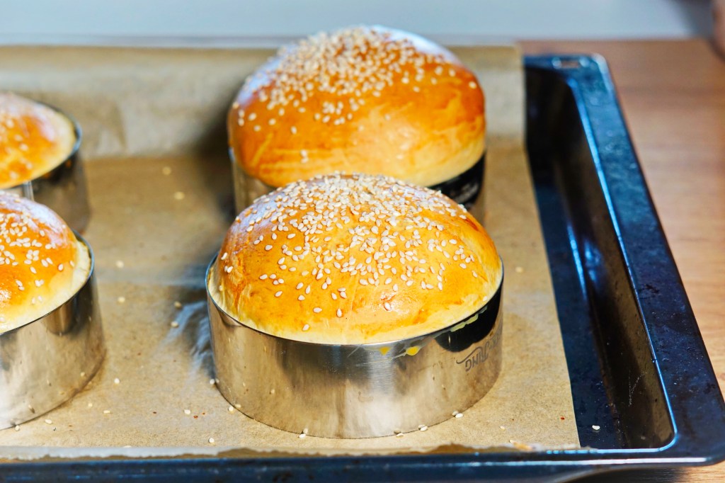 - Bachblech nach dem Ende der Garzeit aus dem Ofen nehmen, Edelstahlringe entfernen und die Buns auskühlen lassen, am Besten sofort für euren Lieblingsburger verwenden.