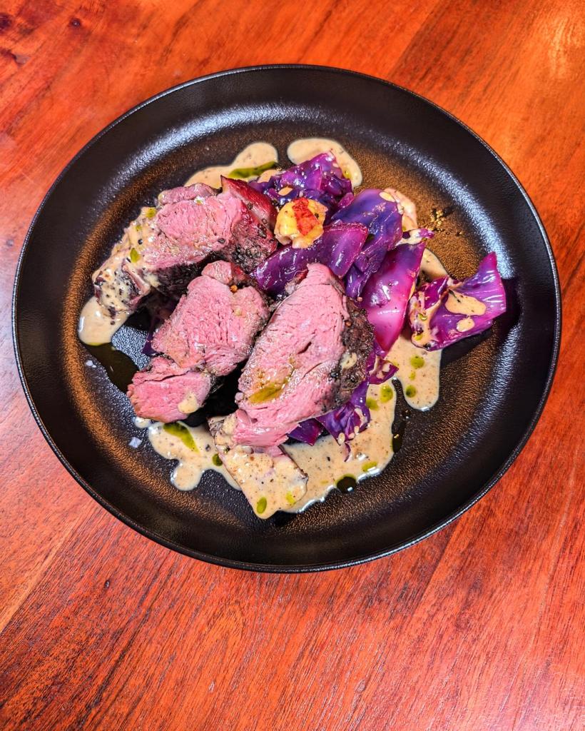 - Reh in Tranchen schneiden und auf dem Rotkraut anrichten.