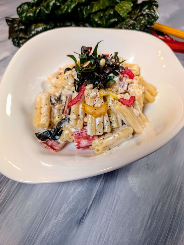 - Pasta auf einem Teller anrichten, geröstete Pinienkerne und die feinen Mangoldstreifen darüber geben und genießen.